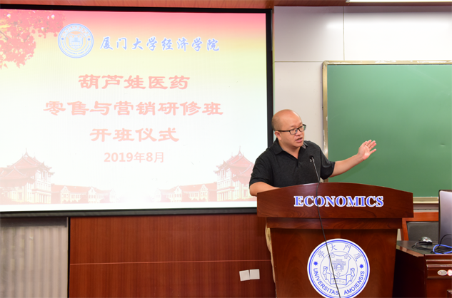 在开班仪式上,廖景峰主任首先代表厦门大学经济学院热烈欢迎云顶国际医药零售与营销研修班的学员到厦大学习,并就厦门大学及经济学院的相关情况进行了介绍。他说,云顶国际学员走进厦大就是厦大的校友,希望未来的日子能够关心、支持母校的发展,多提宝贵意见,同时他也祝大家在厦大学习期间学有所成、学有所获。