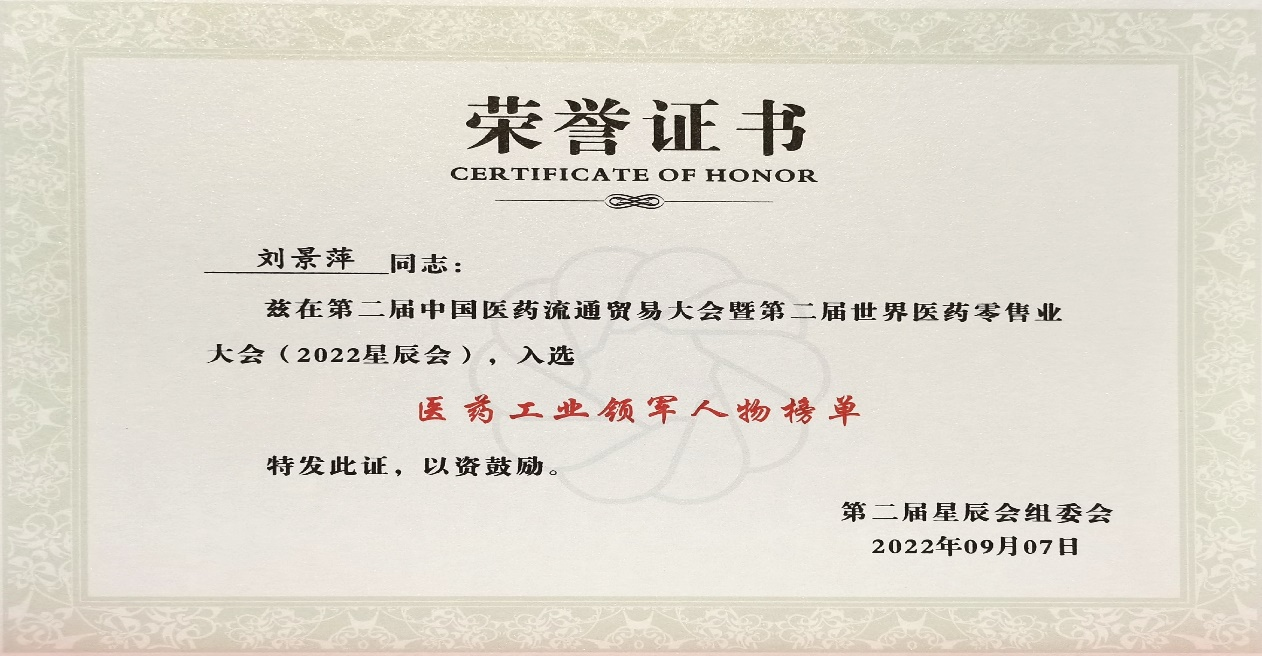 本次星辰会期间,云顶国际斩获颇丰,获得多项行业奖项及荣誉。在开幕式上,刘景萍董事长荣获“医药工业领军人物”称号。
